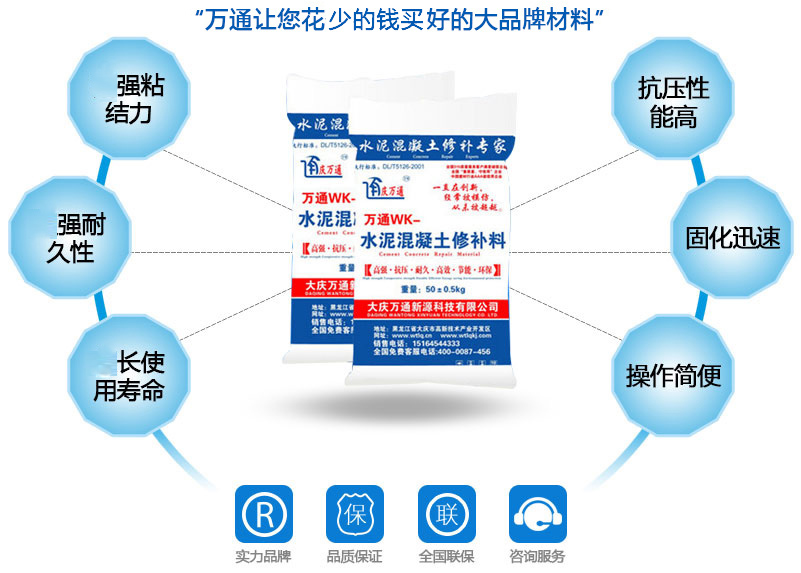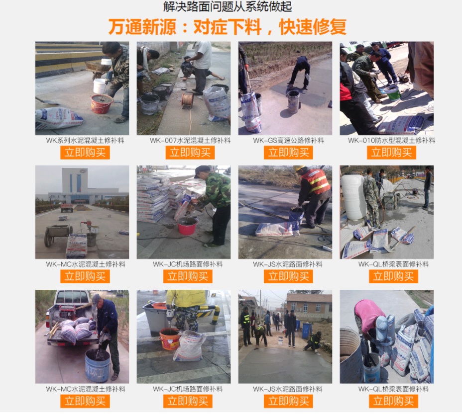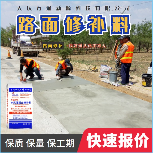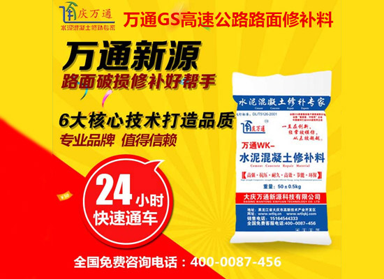 大慶萬通新源科技有限公司獨(dú)有的混凝土路面高強(qiáng)速補(bǔ)料,是水泥混凝土路面病害修復(fù)的好材料。疲勞、凍融循環(huán)、彎曲壓力、滲水和基層破壞等原因都會(huì)引起水泥路面的破損,從而帶來高昂的維護(hù)費(fèi)用。與以往的剛性修補(bǔ)方法不同,混凝土水泥路面維修速補(bǔ)膠提供了一種獨(dú)特的柔性修補(bǔ)產(chǎn)品和技術(shù),高柔性、高抗拉性,可跨伸縮縫施工和高抗壓性使得混凝土快補(bǔ)產(chǎn)品為水泥混凝土路面提供了******性的修補(bǔ)。傳統(tǒng)的剛性修補(bǔ)方案,如環(huán)氧砂漿和快干水泥產(chǎn)品,由于其自身的粘結(jié)失效,抗疲勞性低以及與原路面不同的伸縮系數(shù),修補(bǔ)面會(huì)在短時(shí)間內(nèi)失效或產(chǎn)生新的裂縫,需要反復(fù)修補(bǔ),有效期短且費(fèi)用高昂。大慶萬通新源科技有限公司的混凝土水泥路面維修速補(bǔ)膠可以隨原路面一起伸縮,移動(dòng),從而避免了粘結(jié)失效和產(chǎn)生新裂縫。萬通快補(bǔ)產(chǎn)品優(yōu)異的粘結(jié)性、柔韌性和高防滑性,特別適用于水泥路面的淺層粘合修補(bǔ),多邊角混凝土板層修補(bǔ),跨伸縮縫修補(bǔ)以及路面沉陷修補(bǔ)。萬通混凝土病害修補(bǔ)料針對(duì)混凝土起皮起沙、斷板裂縫、蜂窩麻面、坑槽露石子、漏筋掉皮、橋梁的掉皮漏筋快速通車使用時(shí)間長(zhǎng)。應(yīng)用萬通快補(bǔ)產(chǎn)品,施工后一天就可以恢復(fù)交通。大慶萬通新源科技有限公司的萬通水泥路面維修速補(bǔ)膠適用于高速公路、機(jī)場(chǎng)路面、農(nóng)村村村通路面、廠坪、學(xué)校操場(chǎng)、市區(qū)公路、小區(qū)路面、橋梁、水泥路面的修補(bǔ)。使用萬通特快補(bǔ)材料修補(bǔ)路面可以一勞永逸! 水泥地面起砂怎么辦,混凝土修補(bǔ)劑混凝土地面起砂,混凝土地面修補(bǔ),地面起砂怎么辦,